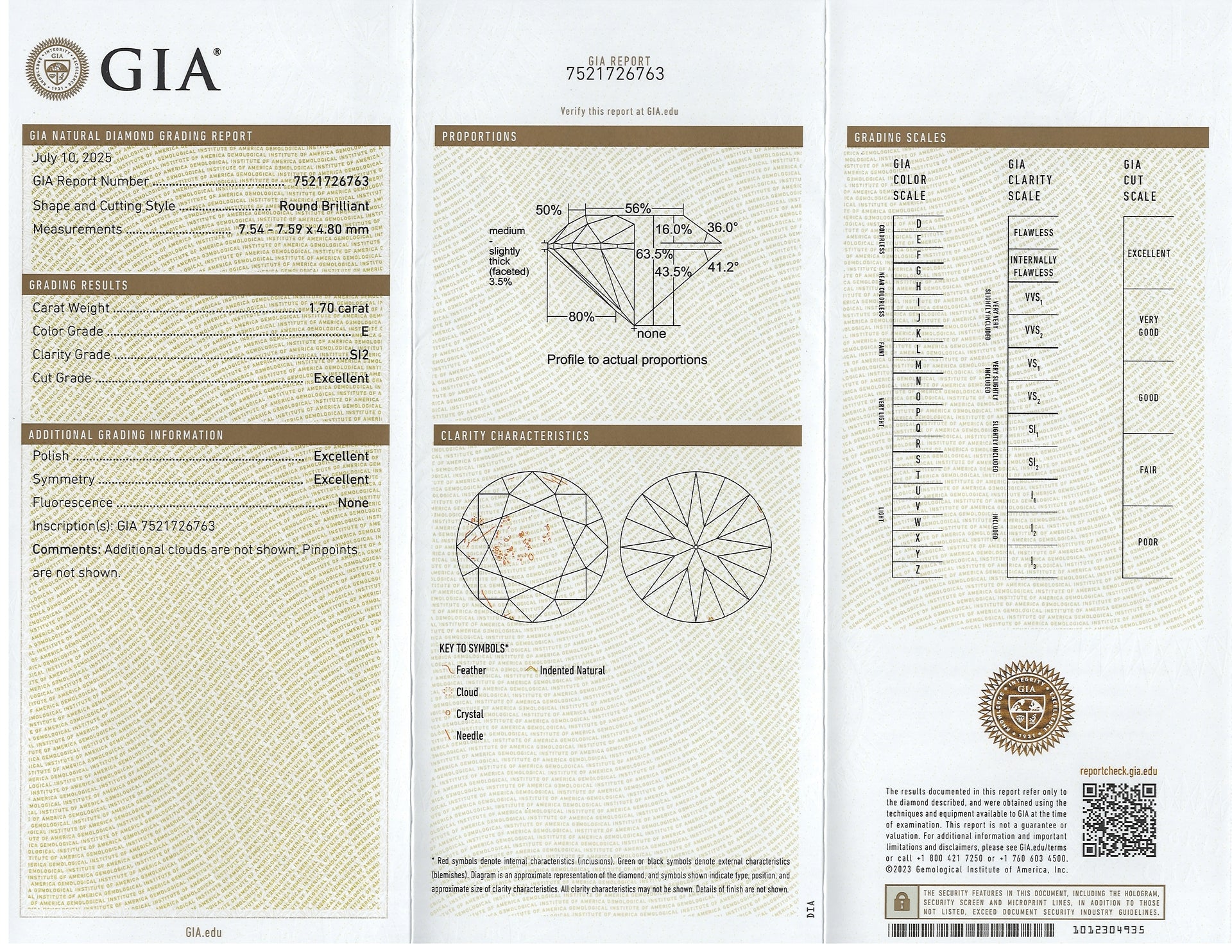1.7ct GIA CERTIFIED DIAMOND 3x EXCELLENT ROUND BRILLIANT CUT E SI2 LOOSE NATURAL