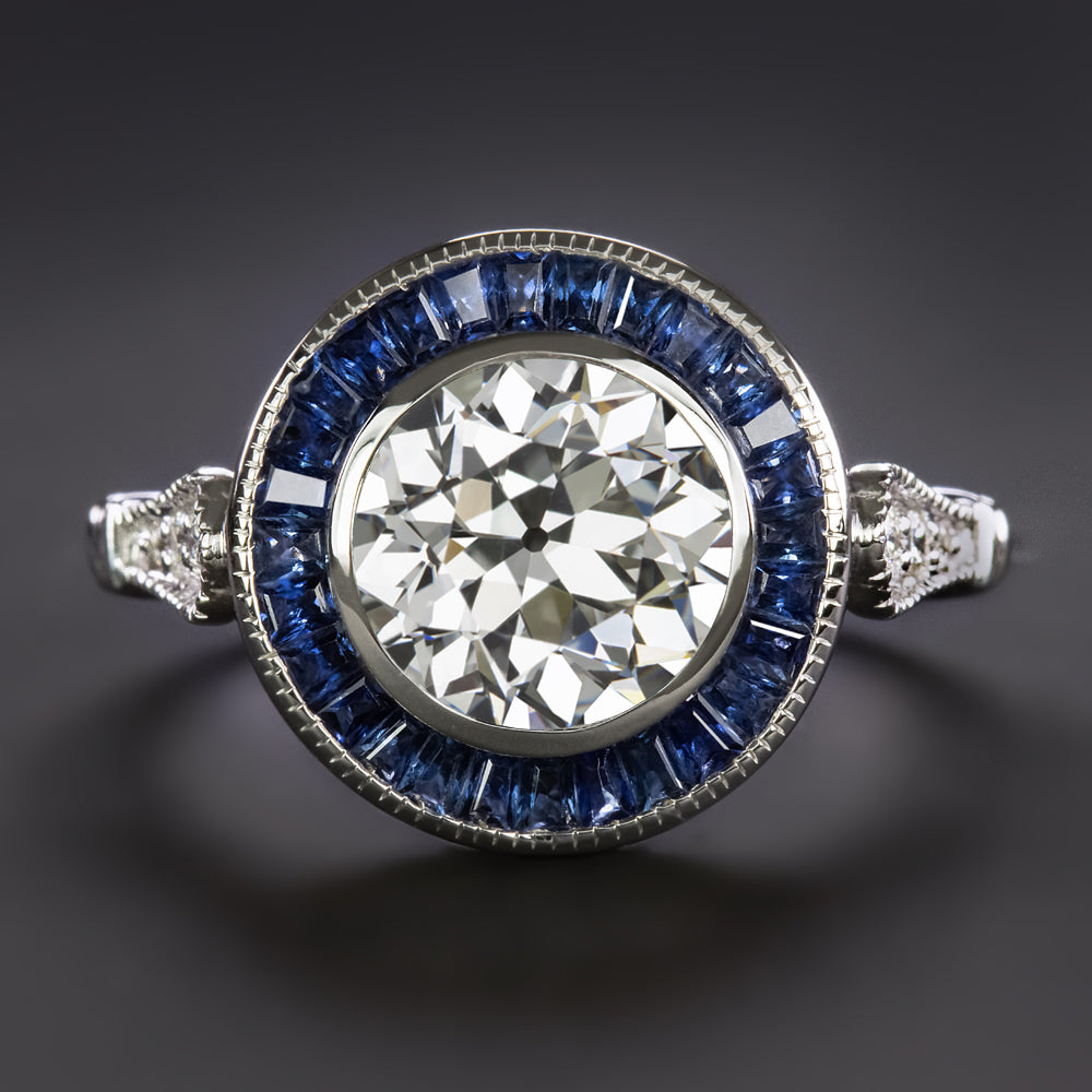 This diamond and sapphire ring has a classic Art Deco style target design and features a gorgeous original vintage diamond! It is an excellent choice for an engagement or cocktail ring.