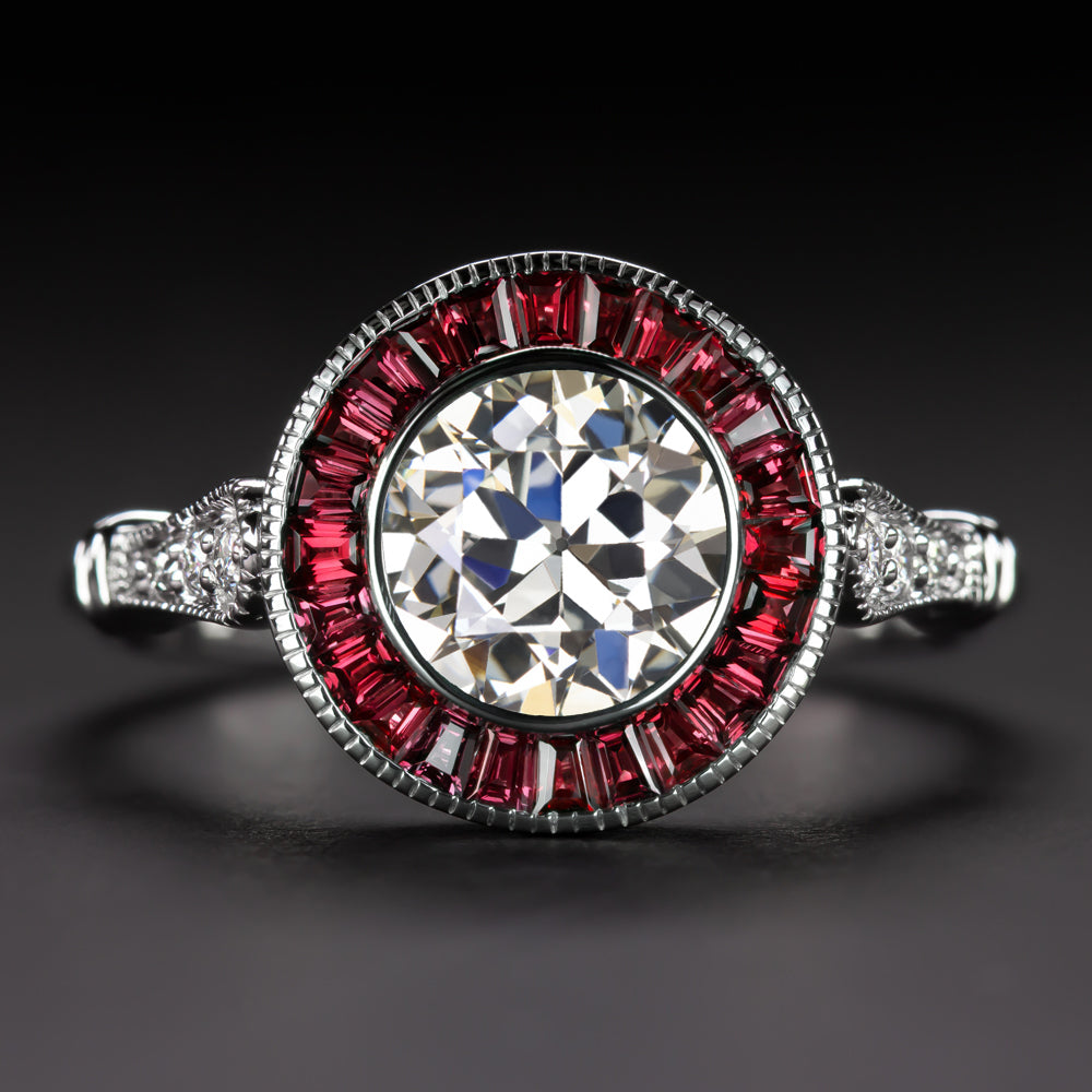 This diamond and ruby ring has a classic Art Deco style target design and features a gorgeous 1 carat diamond! It is an excellent choice for an engagement or cocktail ring.