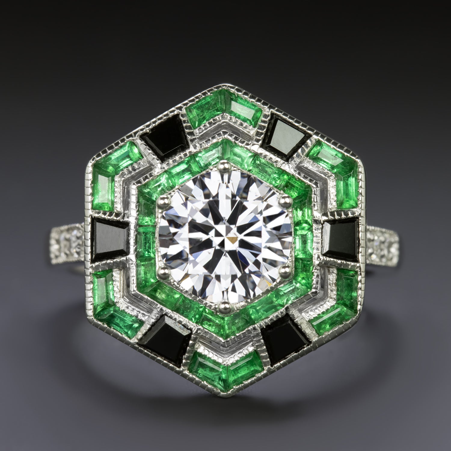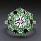 This gorgeous cocktail ring has a striking geometric design with a vibrant 1 carat diamond set at the center of a hexagon shaped double halo studded with spring green emeralds and black onyx!