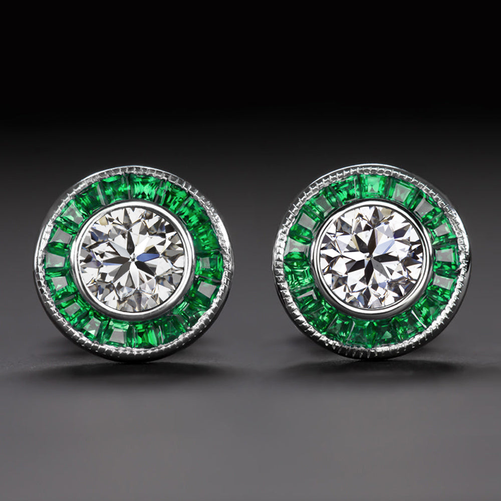 1ct GIA CERTIFIED DIAMOND EMERALD STUD EARRINGS ART DECO STYLE ROUND CUT HALO