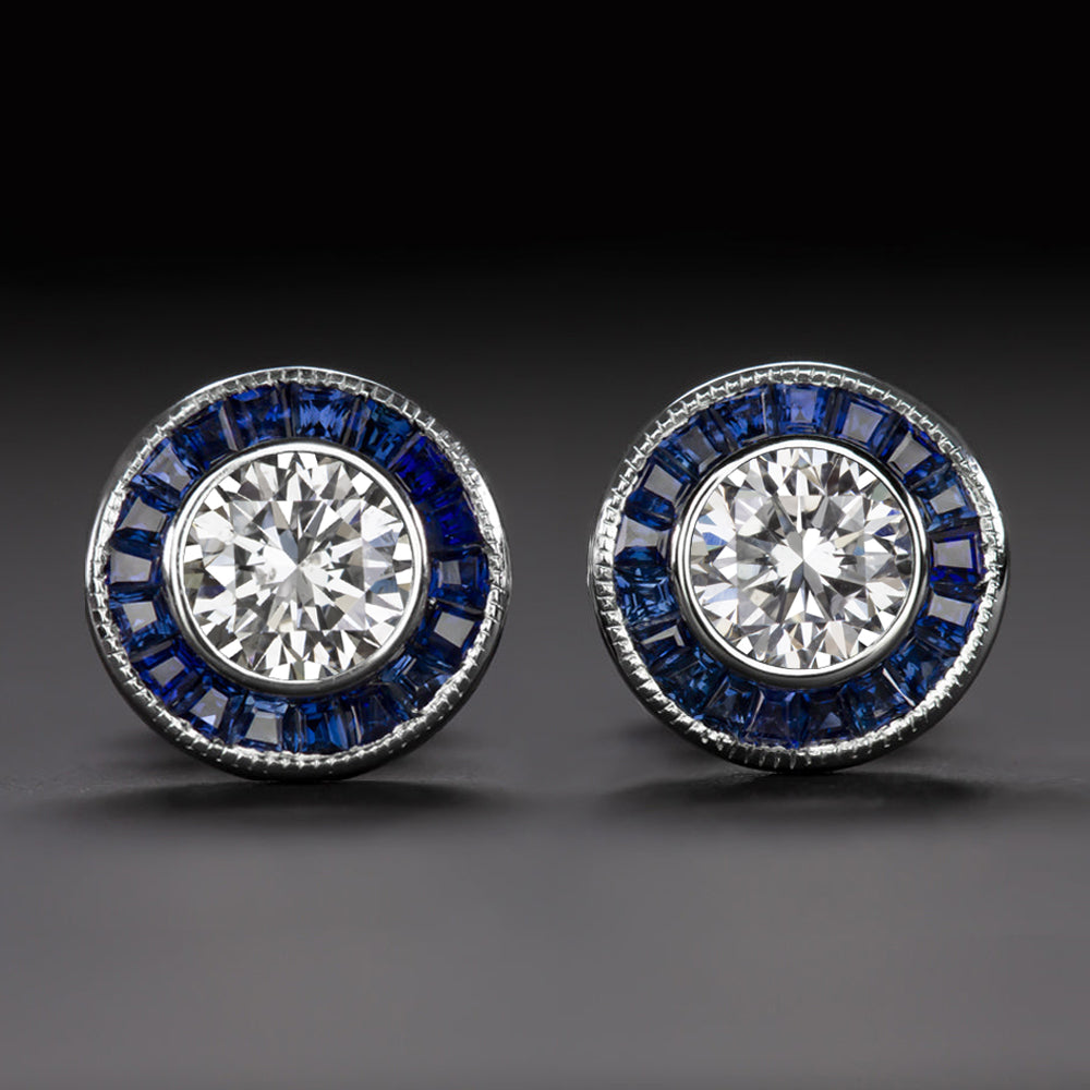 These gorgeous stud earrings feature a 1 carat pair of round brilliant cut diamonds surrounded by rich blue halos of calibre cut sapphires! Absolutely unique and high quality, these Art Deco style earrings have an air of elegance and sophistication!