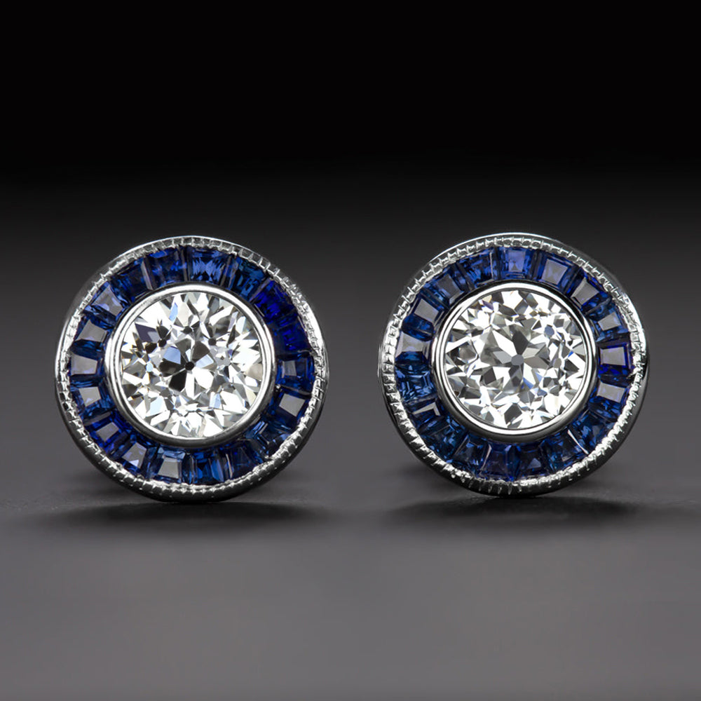 These gorgeous stud earrings feature a 1 carat pair of old European cut diamonds surrounded by rich blue halos of calibre cut sapphires! Absolutely unique and high quality, these Art Deco style earrings have an air of elegance and sophistication!