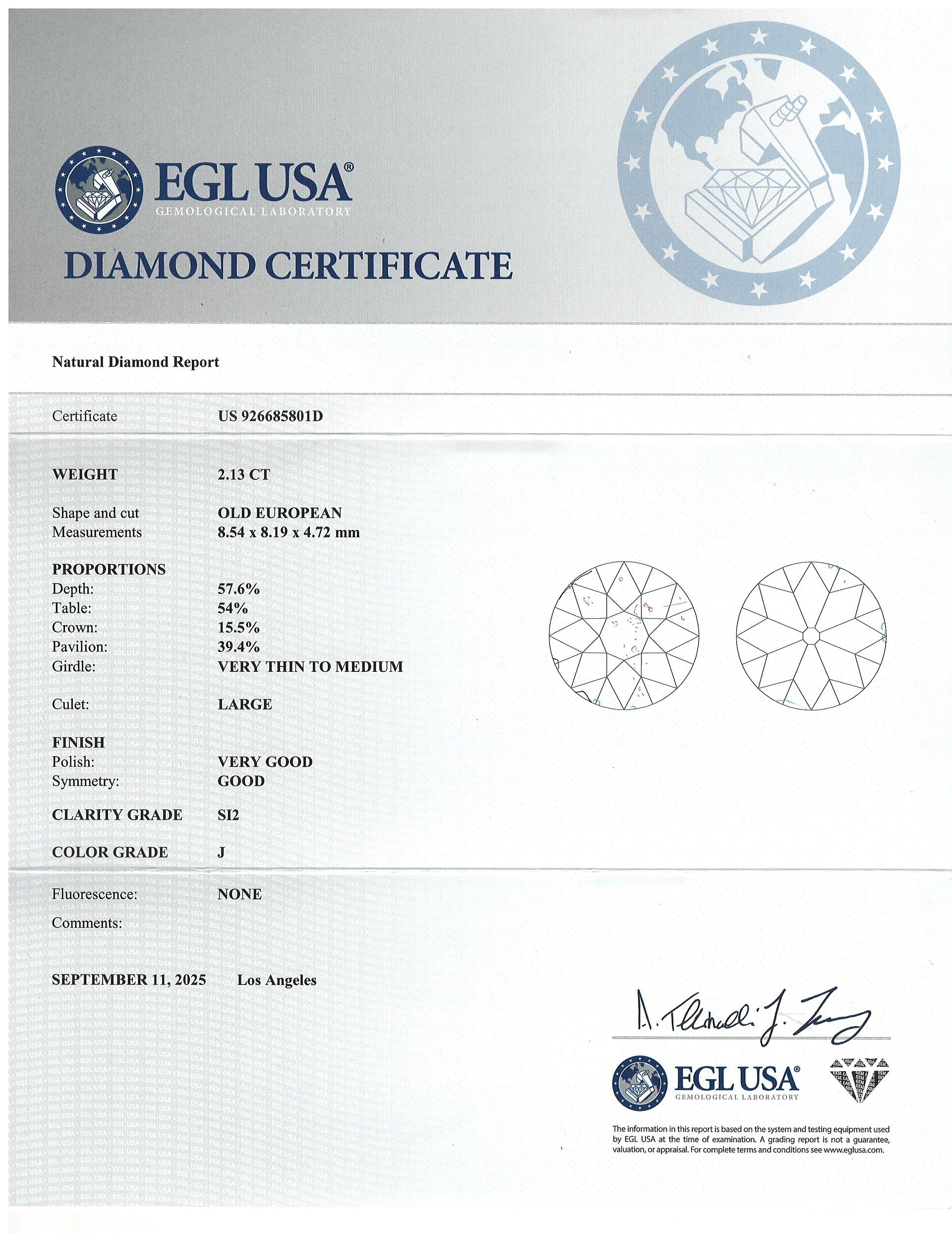 2.13ct OLD EUROPEAN CUT DIAMOND CERTIFIED J SI2 LOOSE VINTAGE NATURAL 2 CARAT