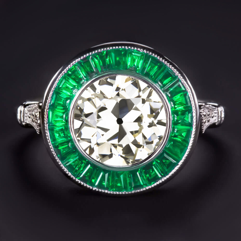 This diamond and emerald ring has a classic Art Deco style target design and features a gorgeous original vintage diamond! It is an excellent choice for an engagement or cocktail ring.
