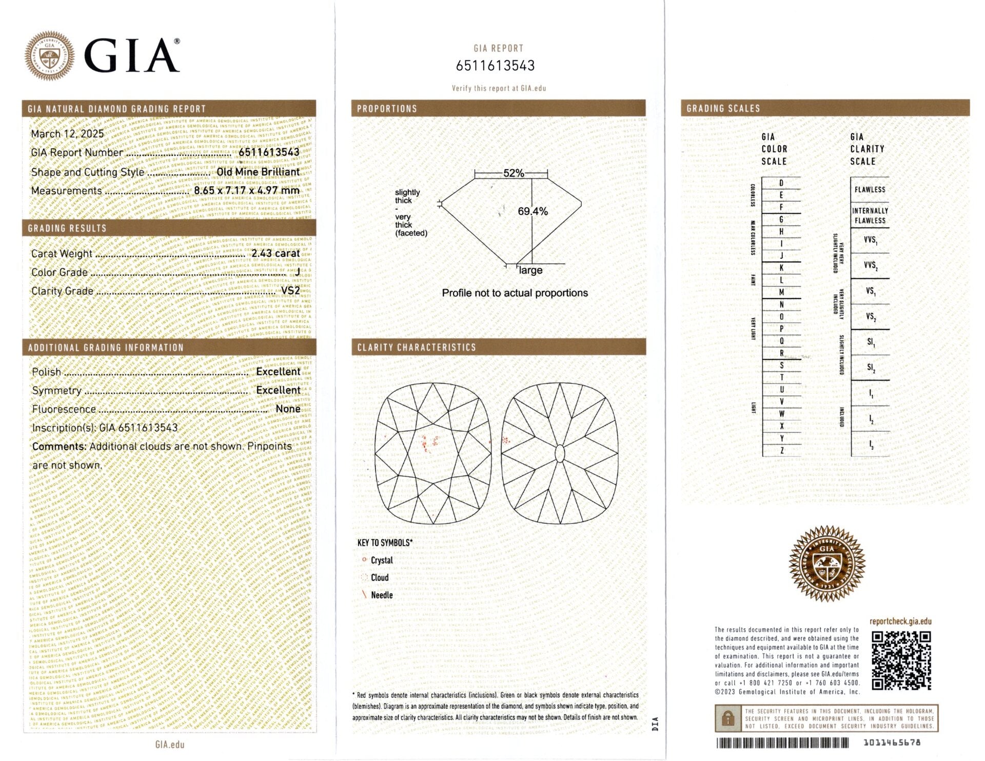 2.43ct OLD MINE CUT DIAMOND GIA CERTIFIED J VS ELONGATED CUSHION BRILLIANT 2.5ct