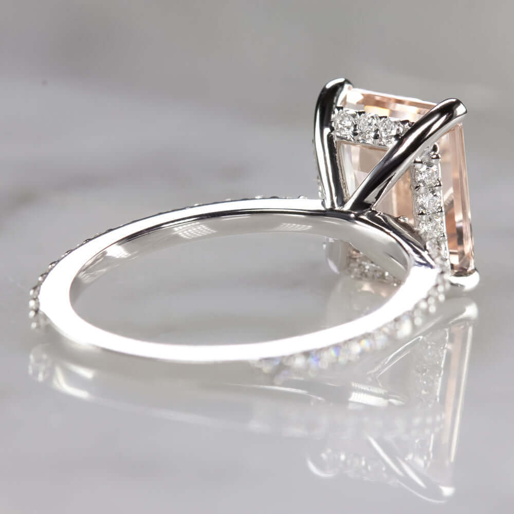 This positively stunning ring features a 2.6ct emerald cut peach morganite and a pave band set with vibrant, bright white and very well cut natural diamonds. The slender yet sturdy band shimmers with pave set diamonds for a fresh and flattering feminine look, and the gallery is encrusted with even more diamonds for some extra sparkle, just for you! Full of bright sparkle and glamorously impressive in size with elegantly feminine color, this stunning ring is an excellent choice for an eye catching cocktail or engagement ring!