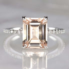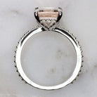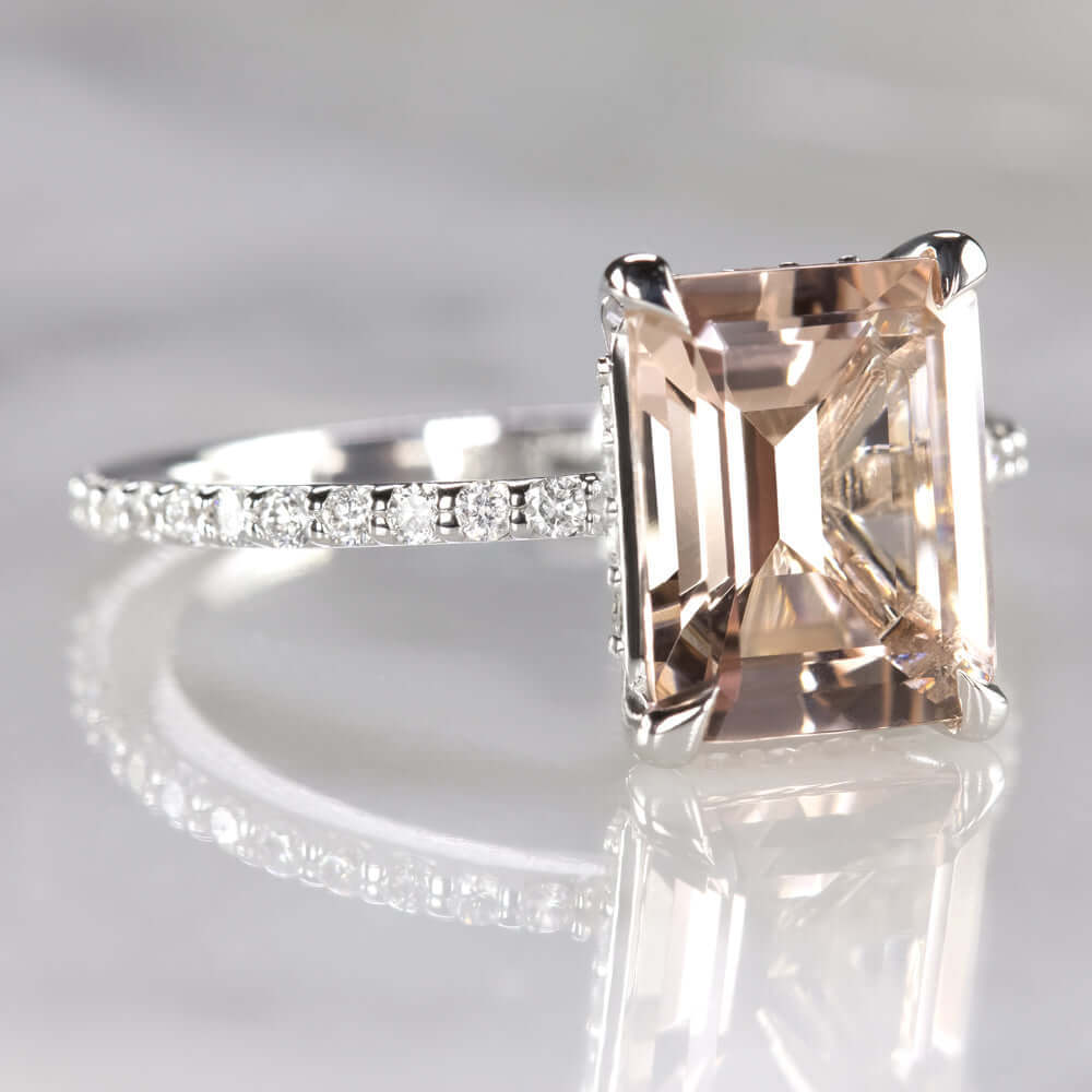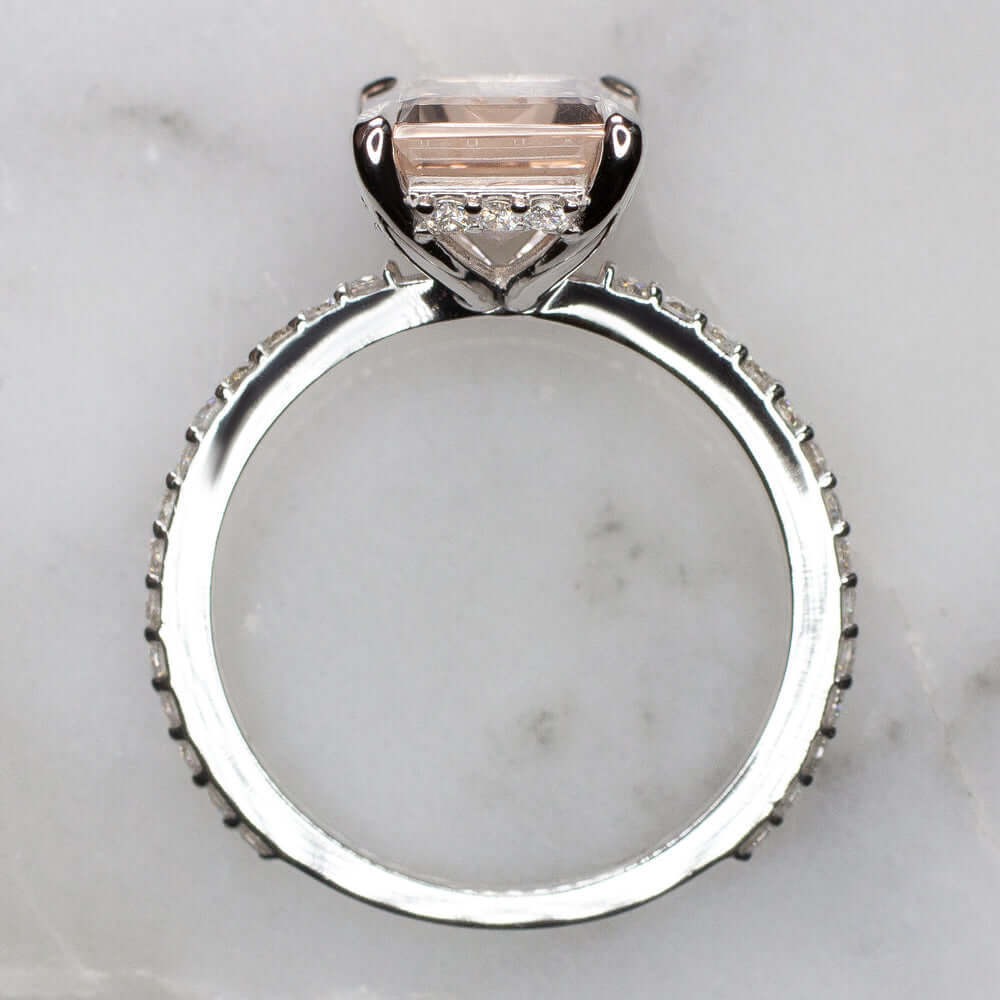 This positively stunning ring features a 2.6ct emerald cut peach morganite and a pave band set with vibrant, bright white and very well cut natural diamonds. The slender yet sturdy band shimmers with pave set diamonds for a fresh and flattering feminine look, and the gallery is encrusted with even more diamonds for some extra sparkle, just for you! Full of bright sparkle and glamorously impressive in size with elegantly feminine color, this stunning ring is an excellent choice for an eye catching cocktail or engagement ring!