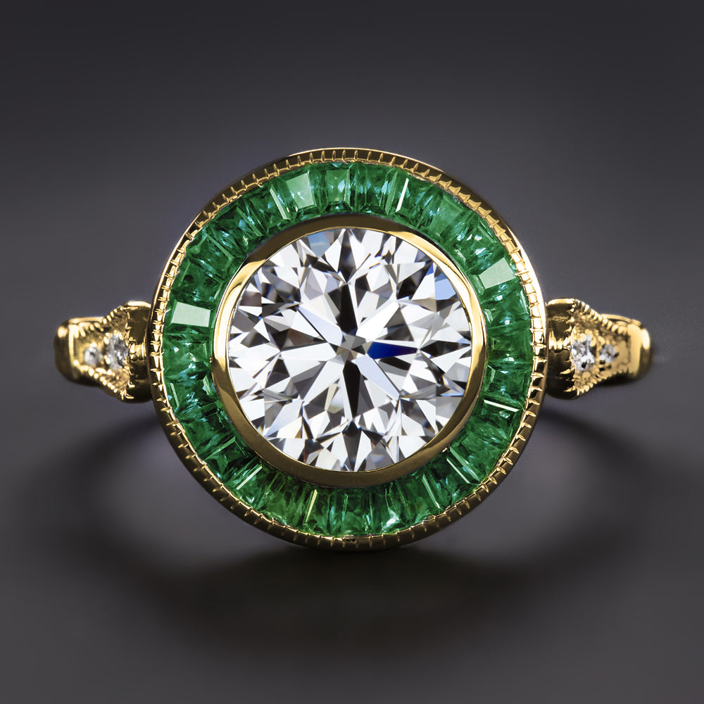 This diamond and emerald ring has a classic Art Deco style target design and features a gorgeous and high quality 2 carat diamond! It is an excellent choice for an engagement or cocktail ring.