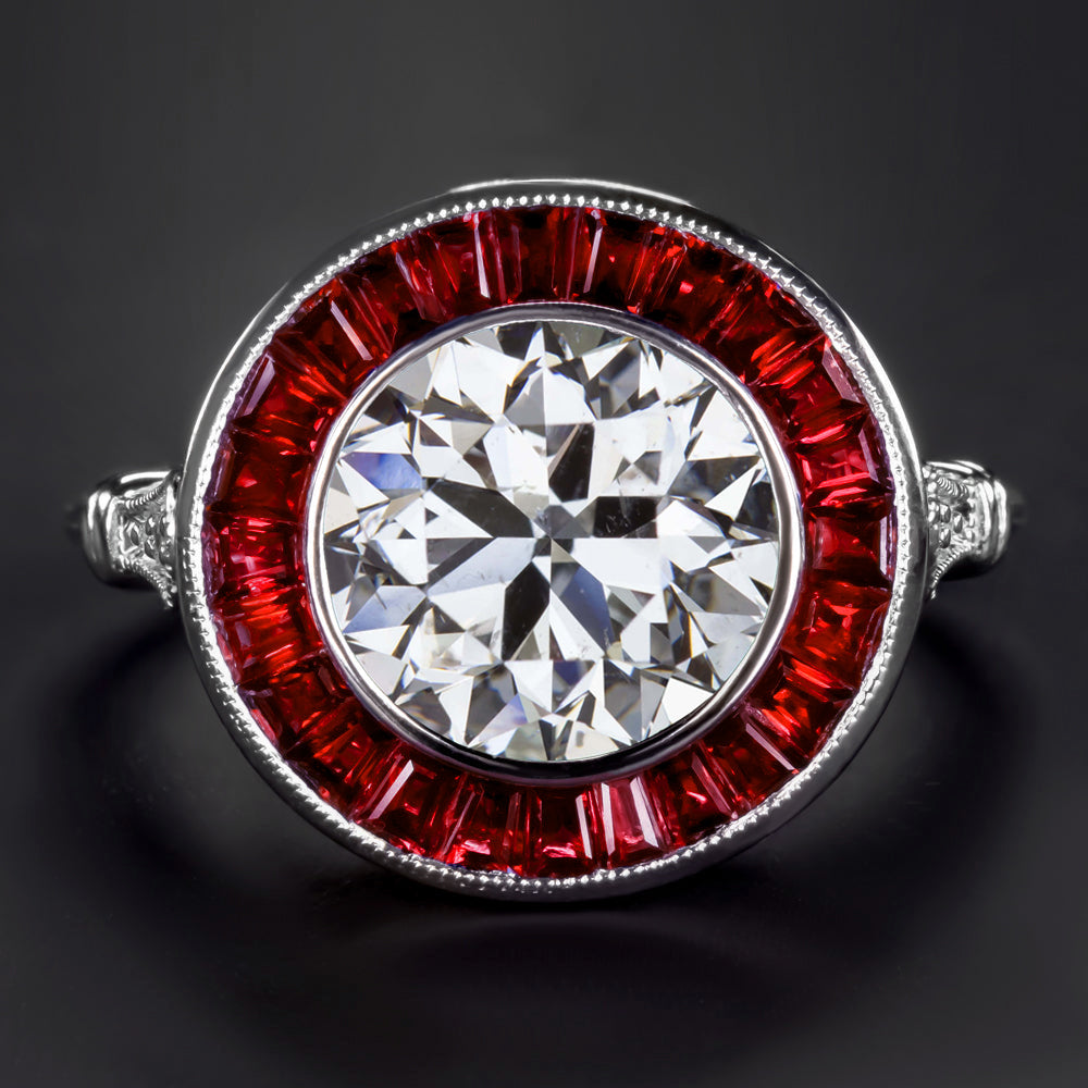 This diamond and ruby ring has a classic Art Deco style target design and features an impressive 3 carat diamond! It is an excellent choice for an engagement or cocktail ring.