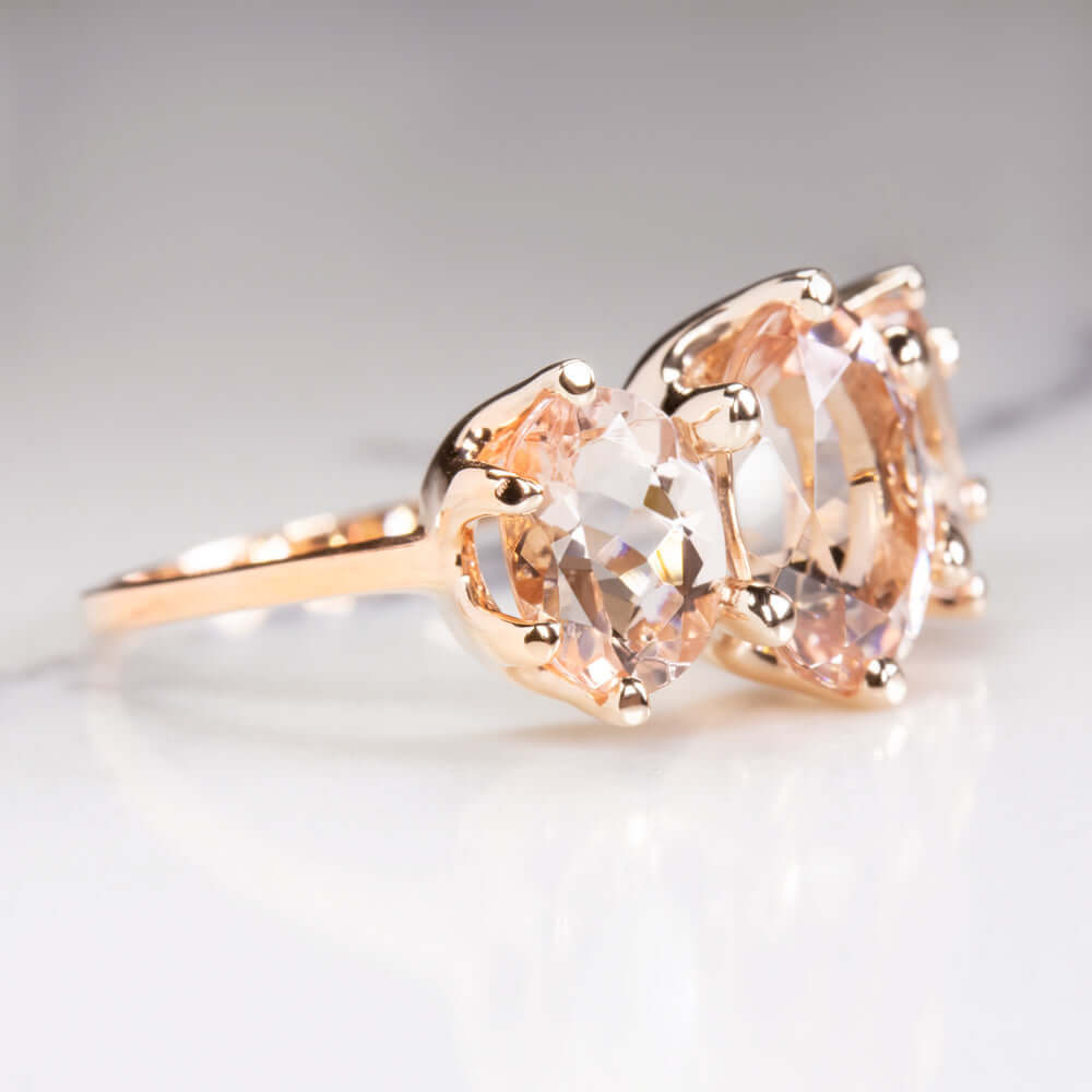 - 4.5ctw of natural pink morganite with 2.4ct (8 x 10mm) on the center and the two side stones weighing 2.1ct (6 x 8mm).