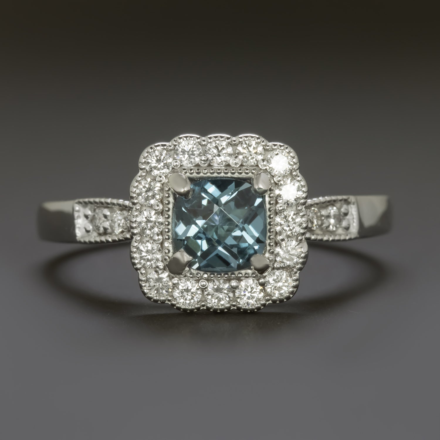 BLUE TOPAZ DIAMOND COCKTAIL RING 14k WHITE GOLD SCALLOP HALO NATURAL CUSHION
