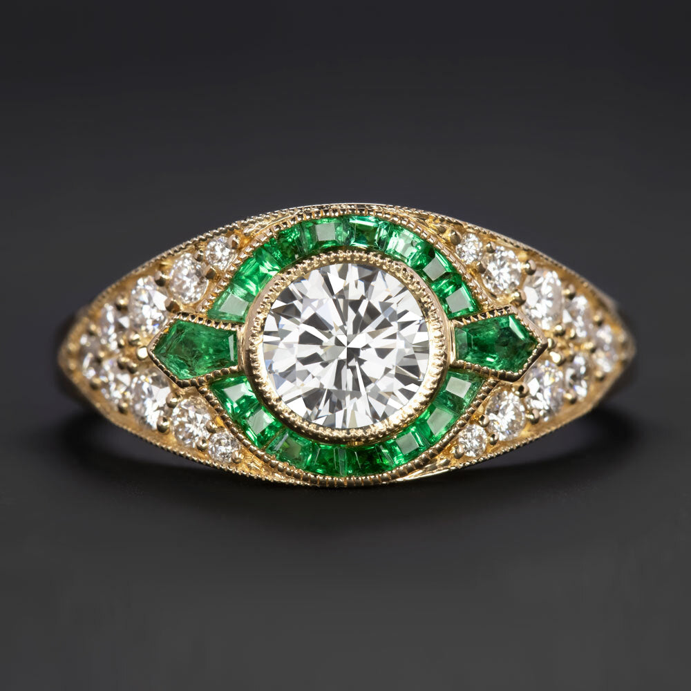 DIAMOND EMERALD ENGAGEMENT RING VINTAGE STYLE ROUND CUT CALIBRE HALO YELLOW GOLD