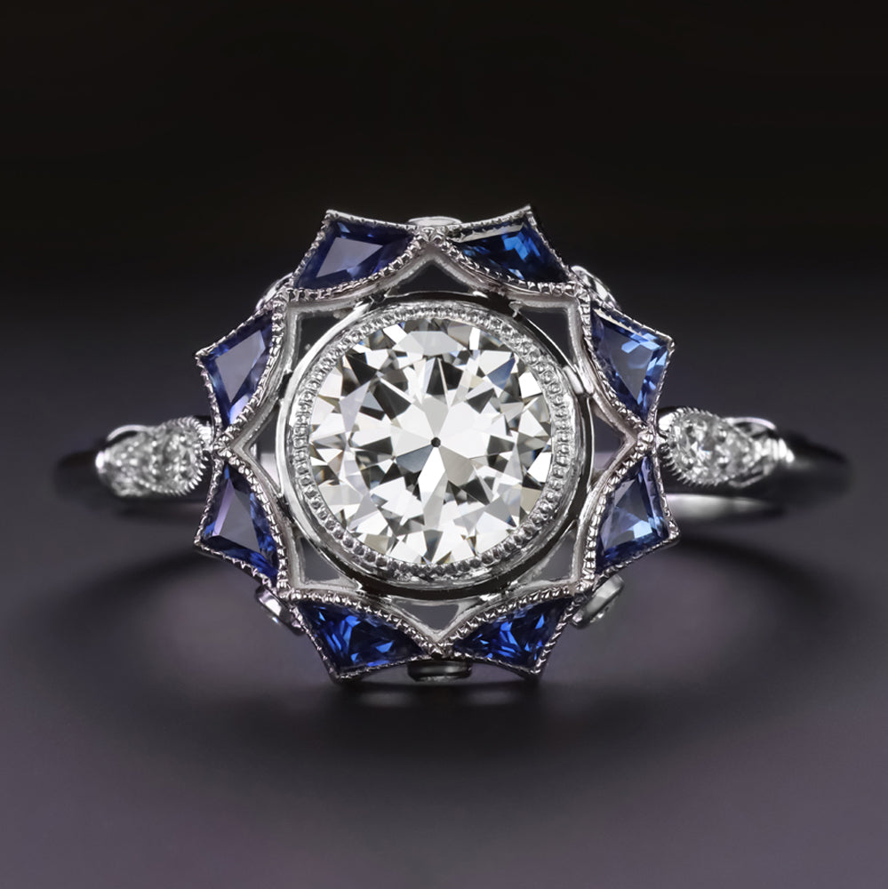 DIAMOND SAPPHIRE COCKTAIL RING 0.90ct GIA CERTIFIED OLD CUT VINTAGE STYLE HALO