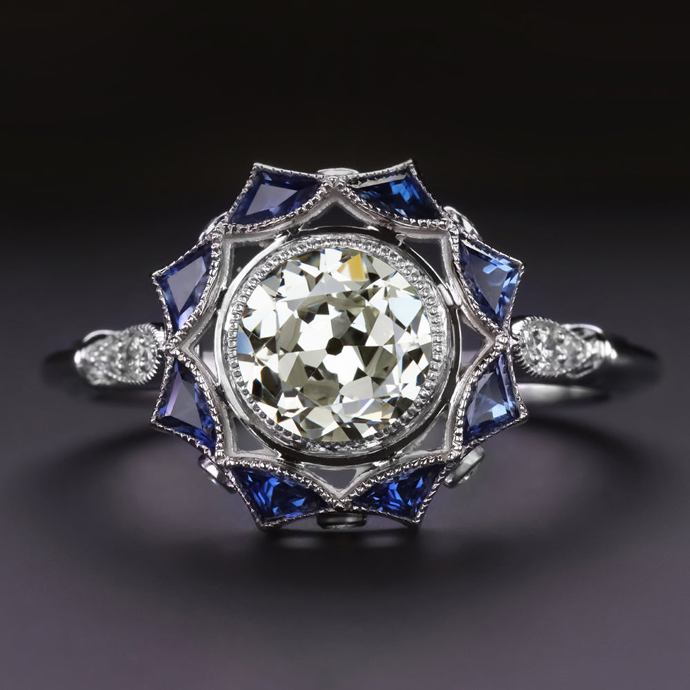 This diamond and sapphire ring has a unique Art Deco inspired design with a halo of fan shaped sapphires surrounding a stunning, vibrant 1.01ct diamond!