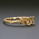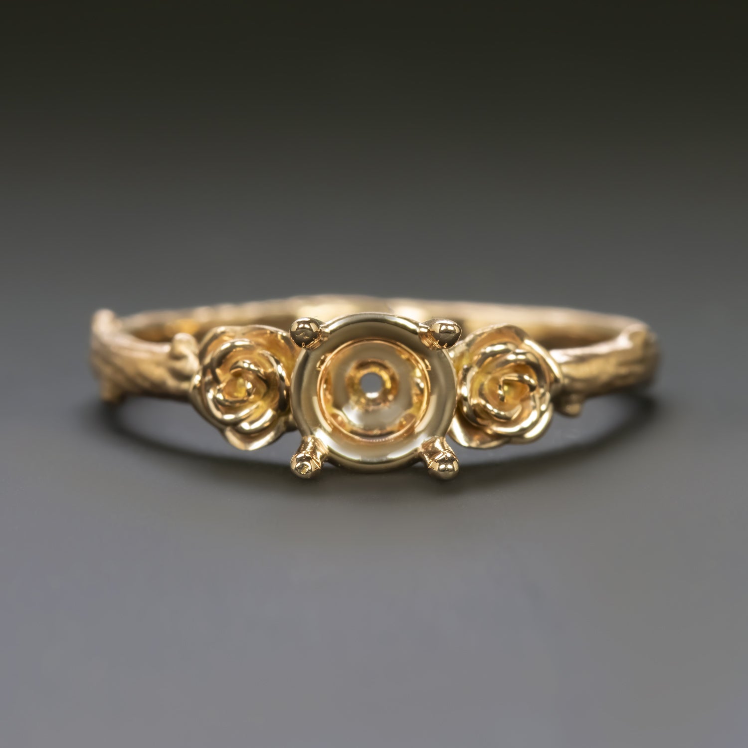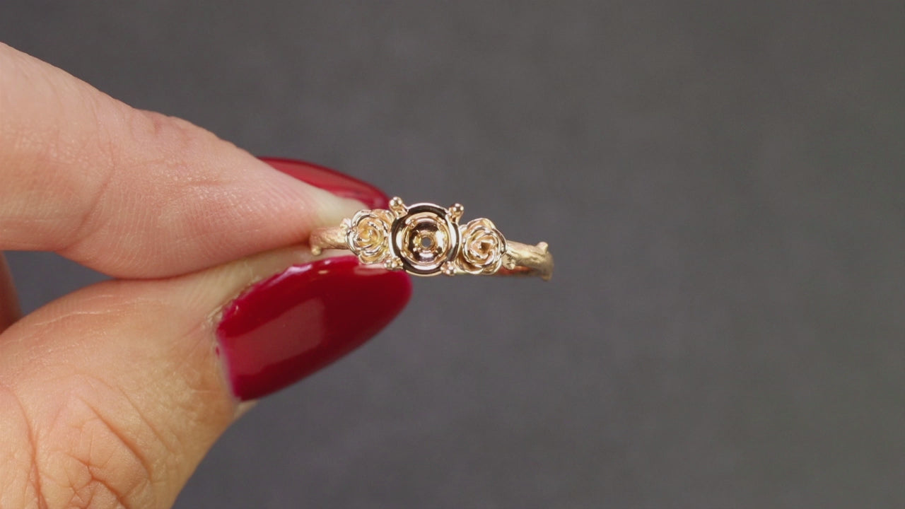 Artfully designed and absolutely unique, this stunning ring setting combines rustic elegance with a sweetly feminine and beautifully modern organic design. The ring’s shoulders are adorned with intricately rendered roses, and the shank has a charming, organic branch texture.