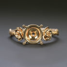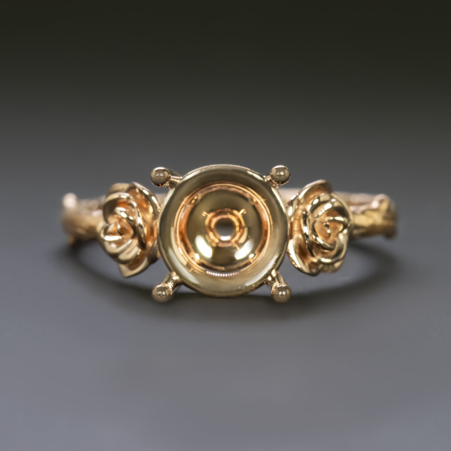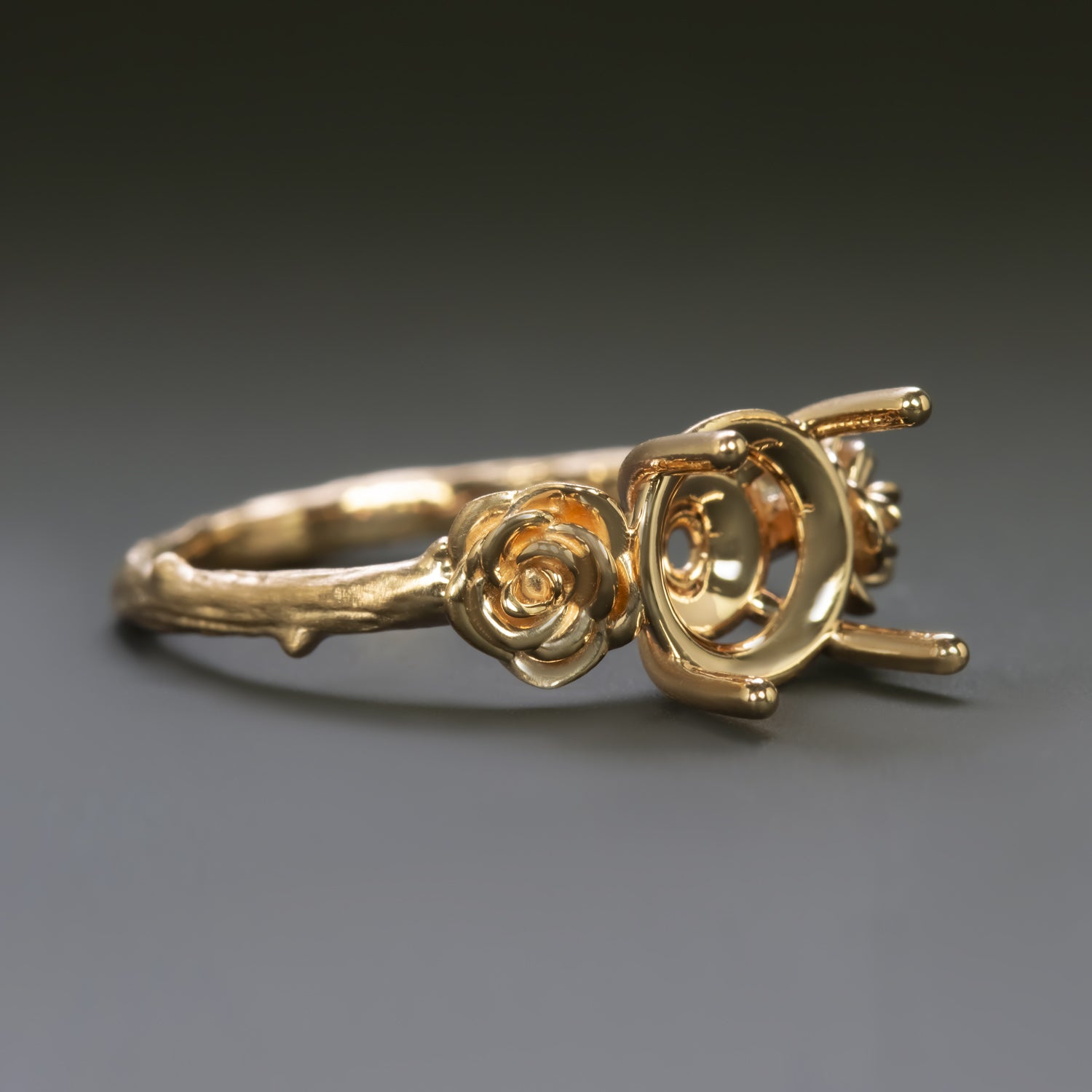 Artfully designed and absolutely unique, this stunning ring setting combines rustic elegance with a sweetly feminine and beautifully modern organic design. The ring’s shoulders are adorned with intricately rendered roses, and the shank has a charming, organic branch texture.