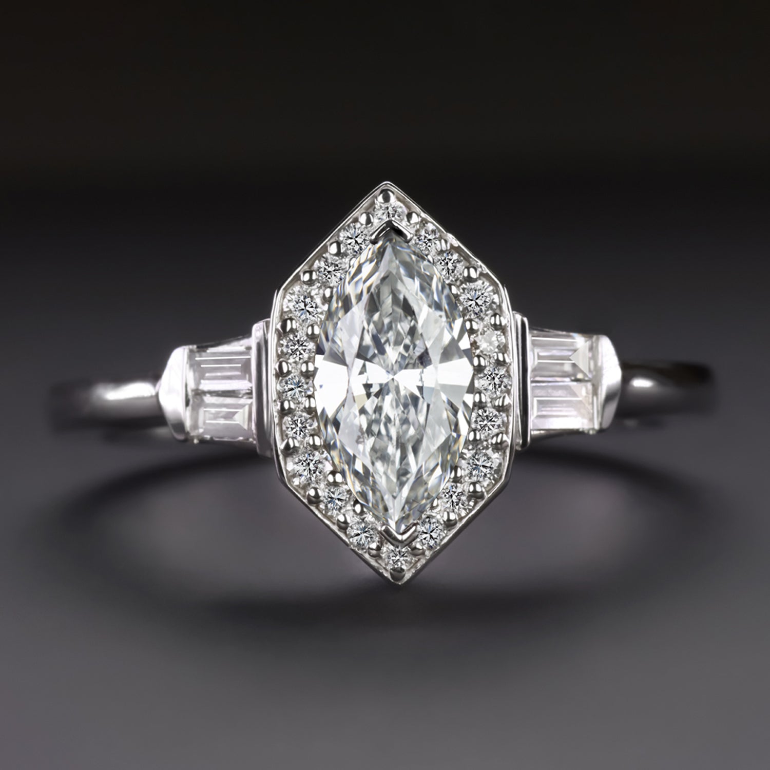 This sleek vintage style engagement ring features a marquise diamond surrounded by a hexagonal diamond halo and flanked by baguette diamonds.