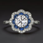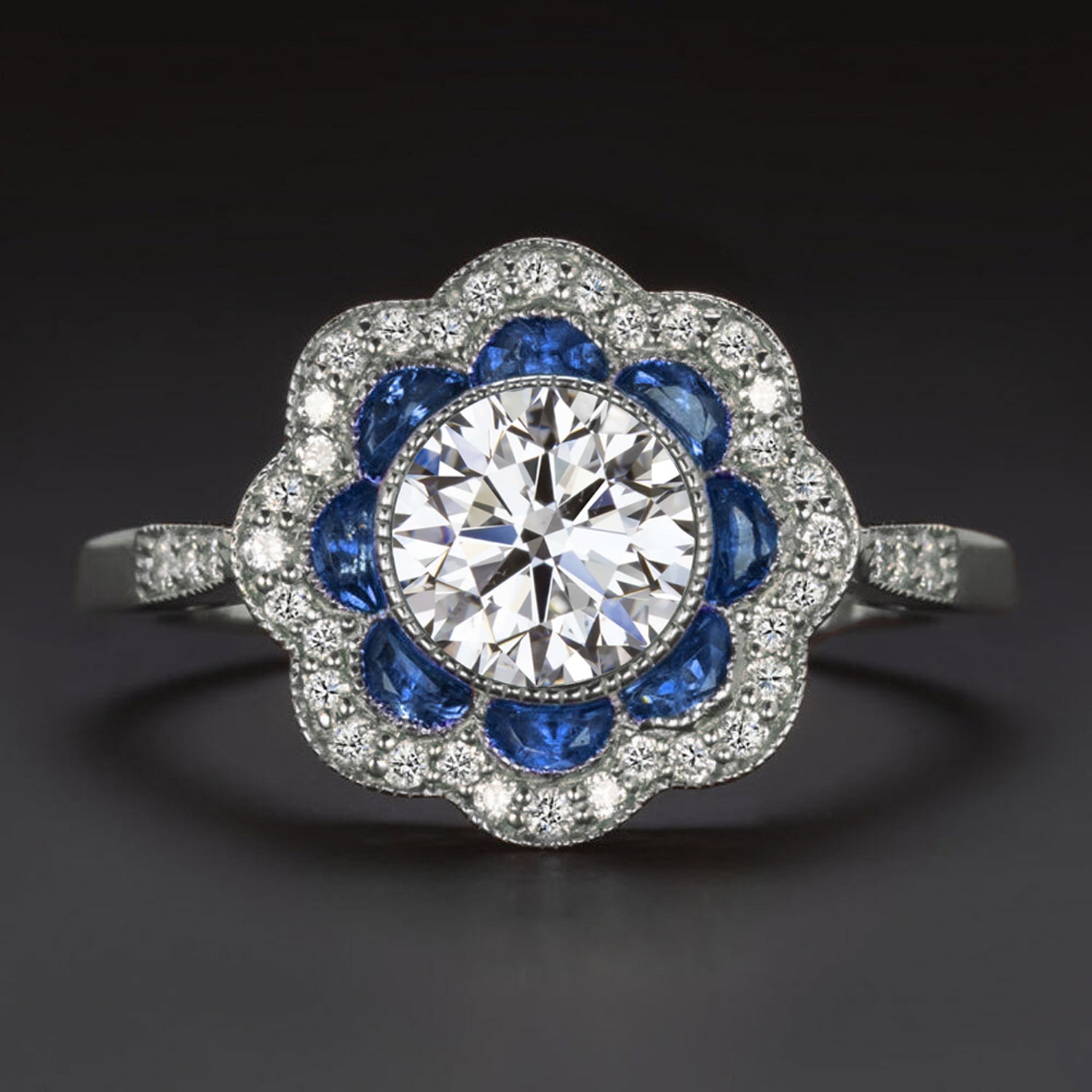 This gorgeous diamond and sapphire halo ring has a charming flower shape and elegant vintage style touches!