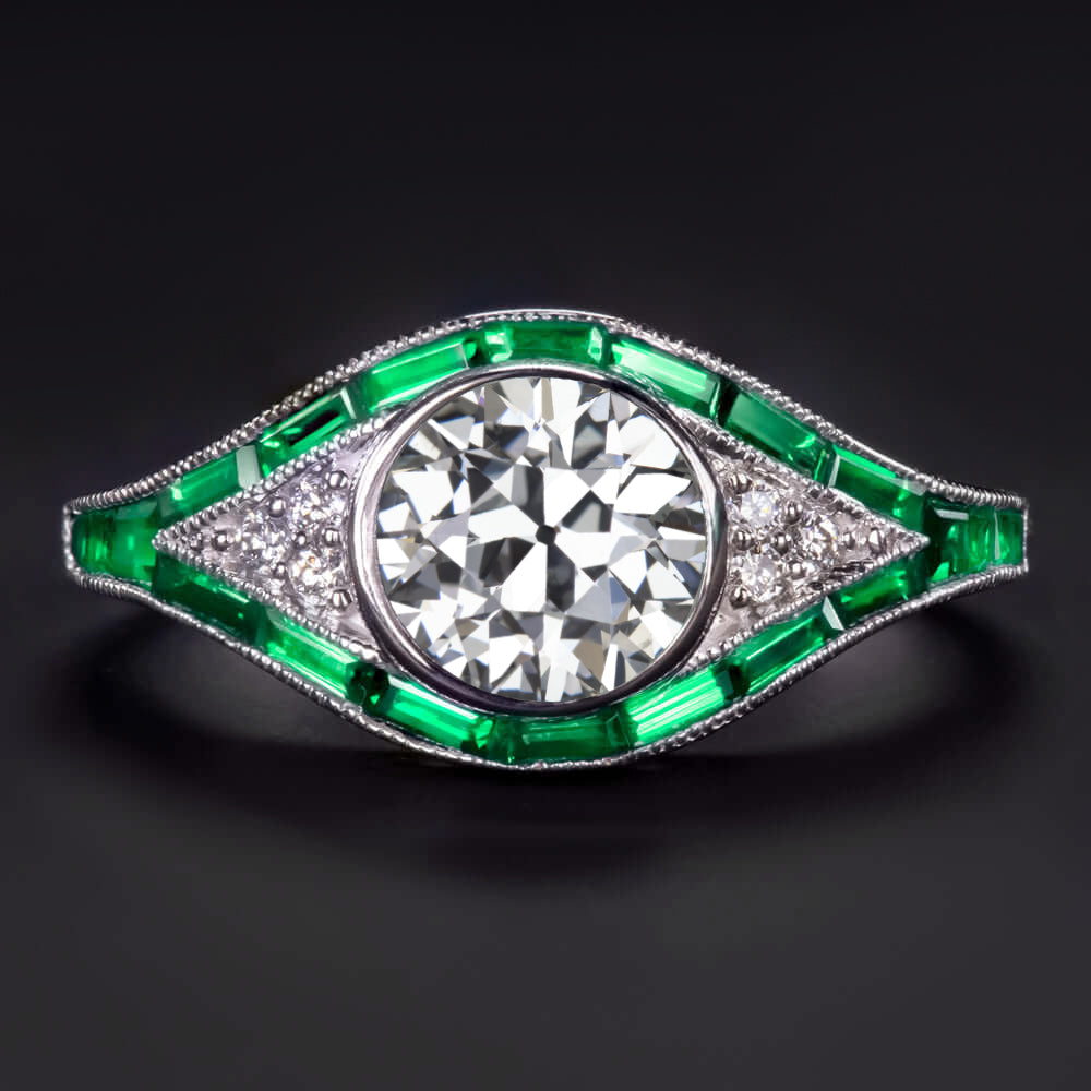 This diamond and emerald ring offers a stunning Art Deco style design, rich color, and gorgeous, substantial sparkle! It is an excellent choice for an engagement or cocktail ring.