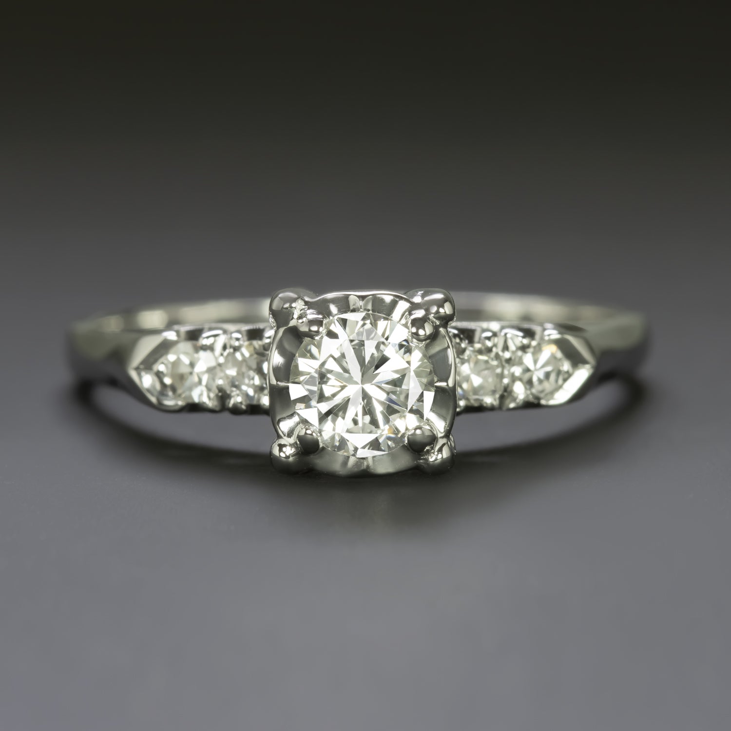 MIDCENTURY VINTAGE DIAMOND ENGAGEMENT RING 14k WHITE GOLD NATURAL ESTATE ROUND