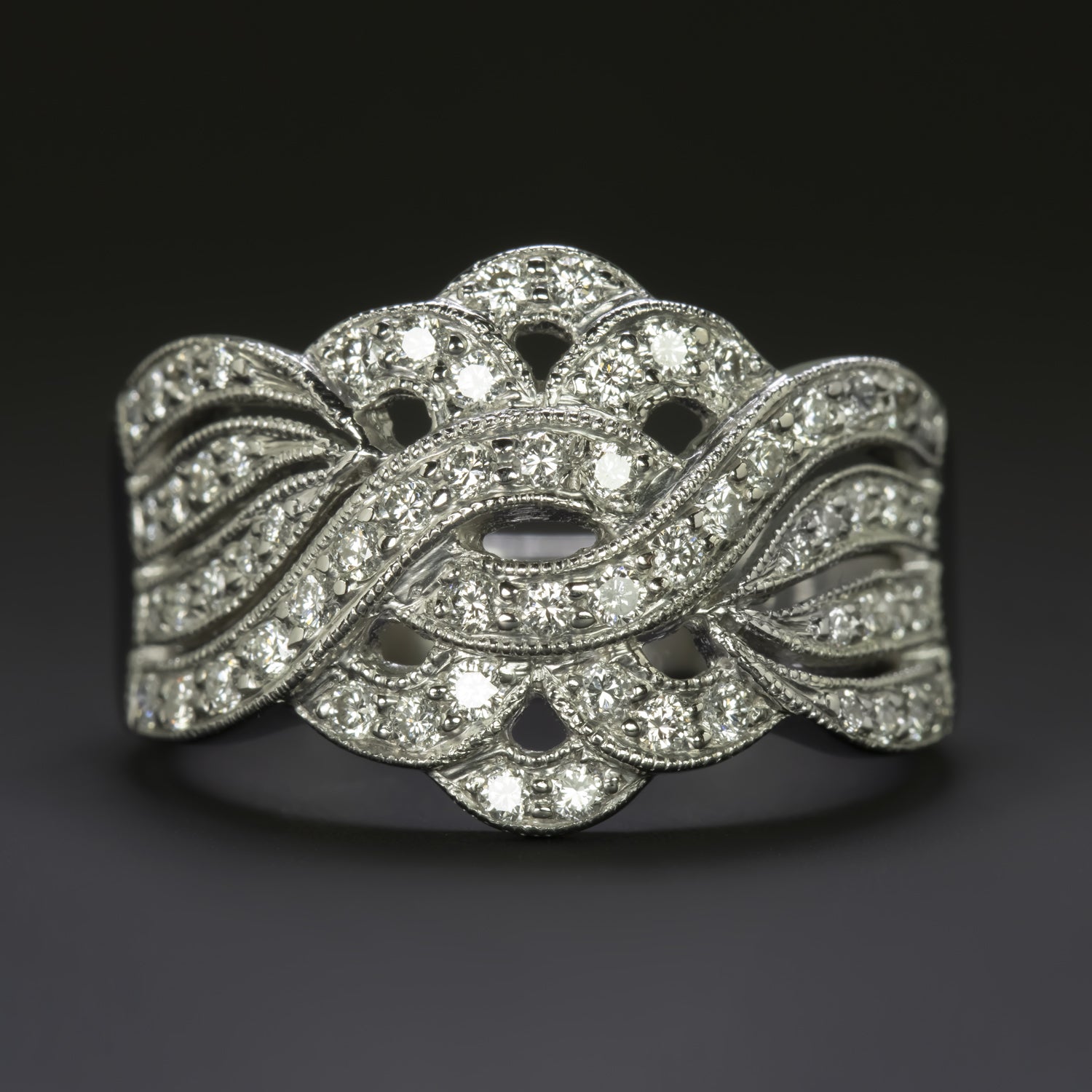NATURAL DIAMOND COCKTAIL RING WIDE BAND 14k WHITE GOLD PAVE RIBBON MILGRAIN