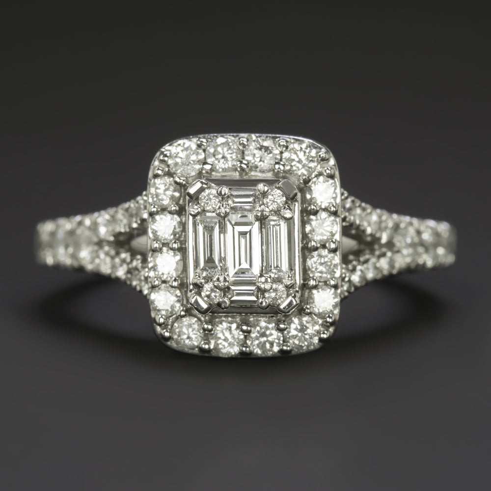 NATURAL DIAMOND RING EMERALD CUT ILLUSION CLUSTER 14k WHITE GOLD ENGAGEMENT 1ct