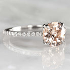 This gorgeous and eye catching ring features a 1.65ct natural pink morganite and a sparkling pave diamond band. The slender yet sturdy band shimmers with pave set diamonds for a fresh and flattering feminine look! Full of bright sparkle and glamorously impressive in size with elegantly feminine color, this stunning ring is an excellent choice for an eye catching cocktail or engagement ring!