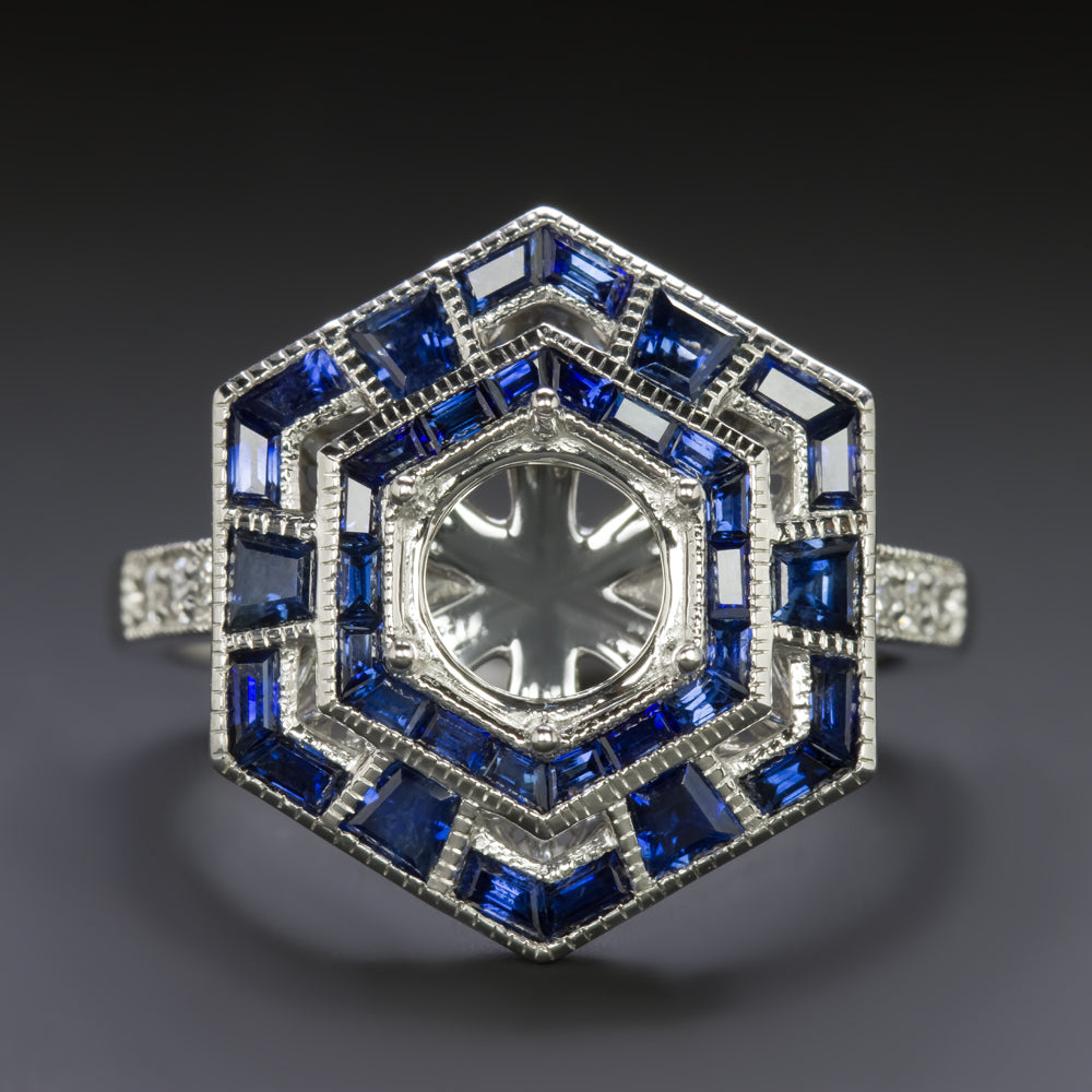 This gorgeous semi-mount has a unique geometric design featuring rich blue sapphires set in a striking hexagon shaped double halo design!