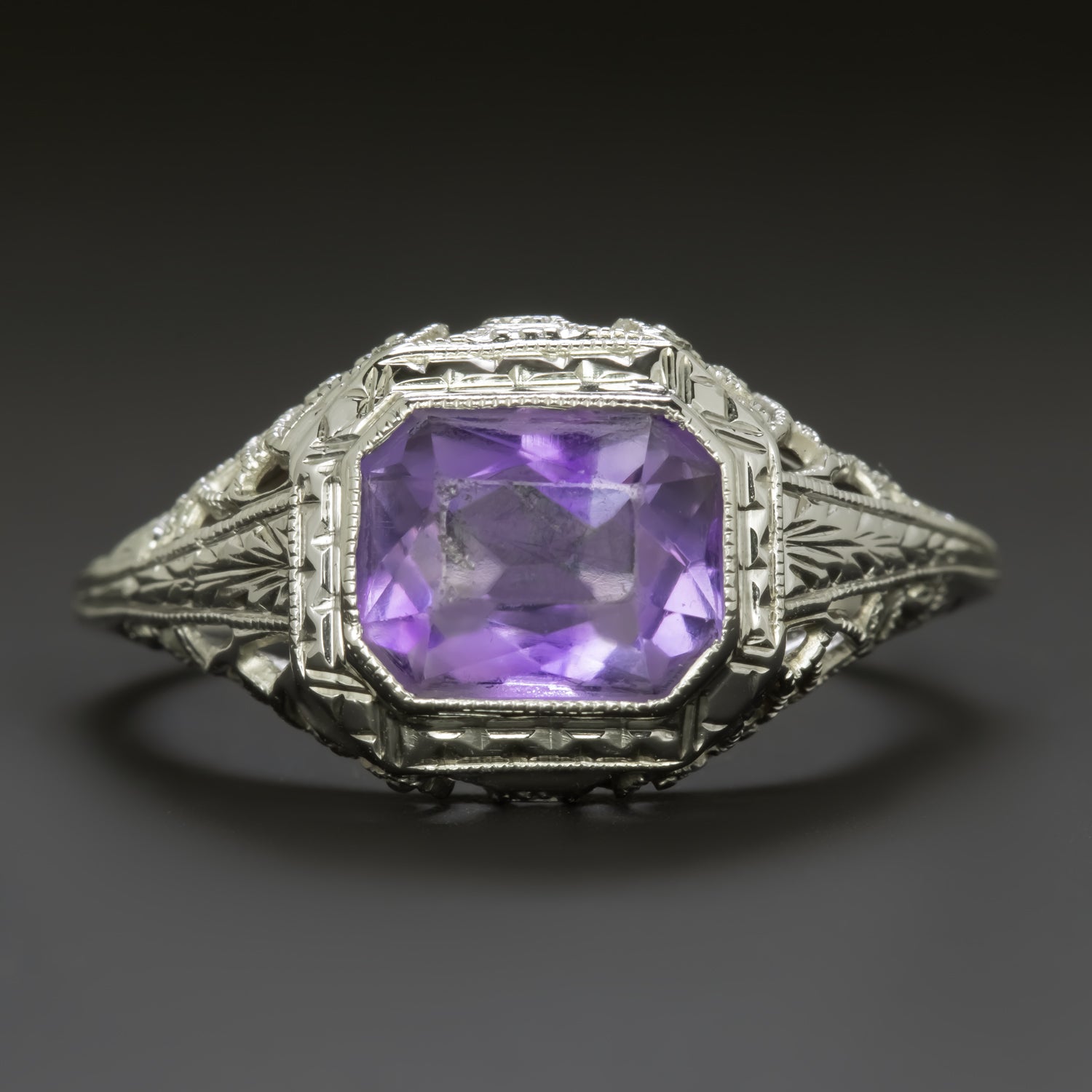 VINTAGE AMETHYST FILIGREE RING 18K WHITE GOLD SOLITAIRE ART DECO ESTATE PURPLE