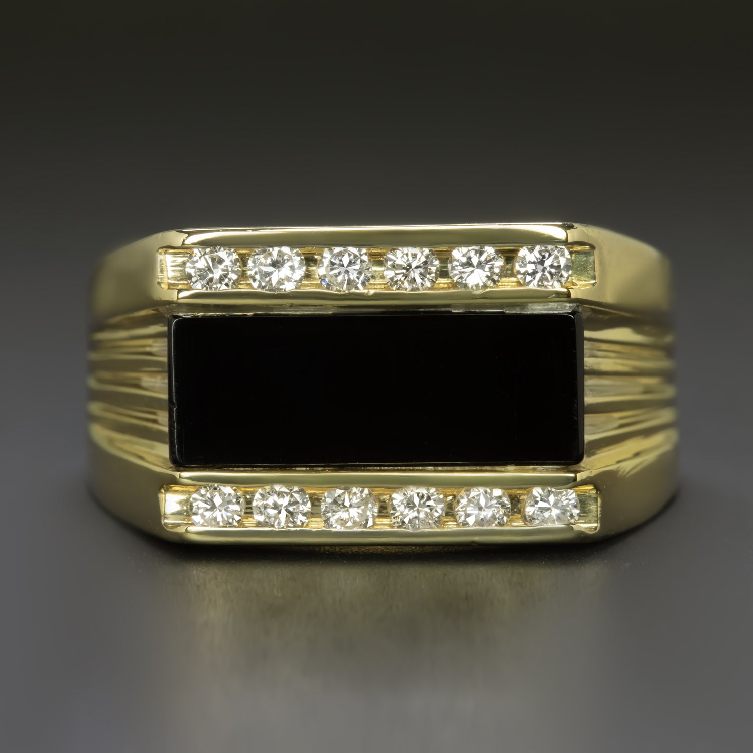 This vintage black onyx and diamond ring has a bold and broad design featuring a deep black field of black onyx bordered by glittering diamonds and set in chunky 14k yellow gold.
