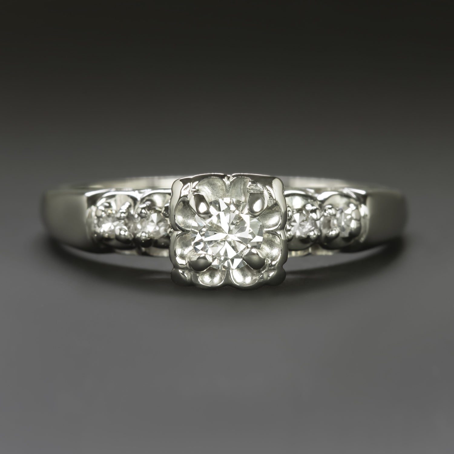 VINTAGE DIAMOND ENGAGEMENT RING MID CENTURY ILLUSION 14k WHITE GOLD ROUND ESTATE