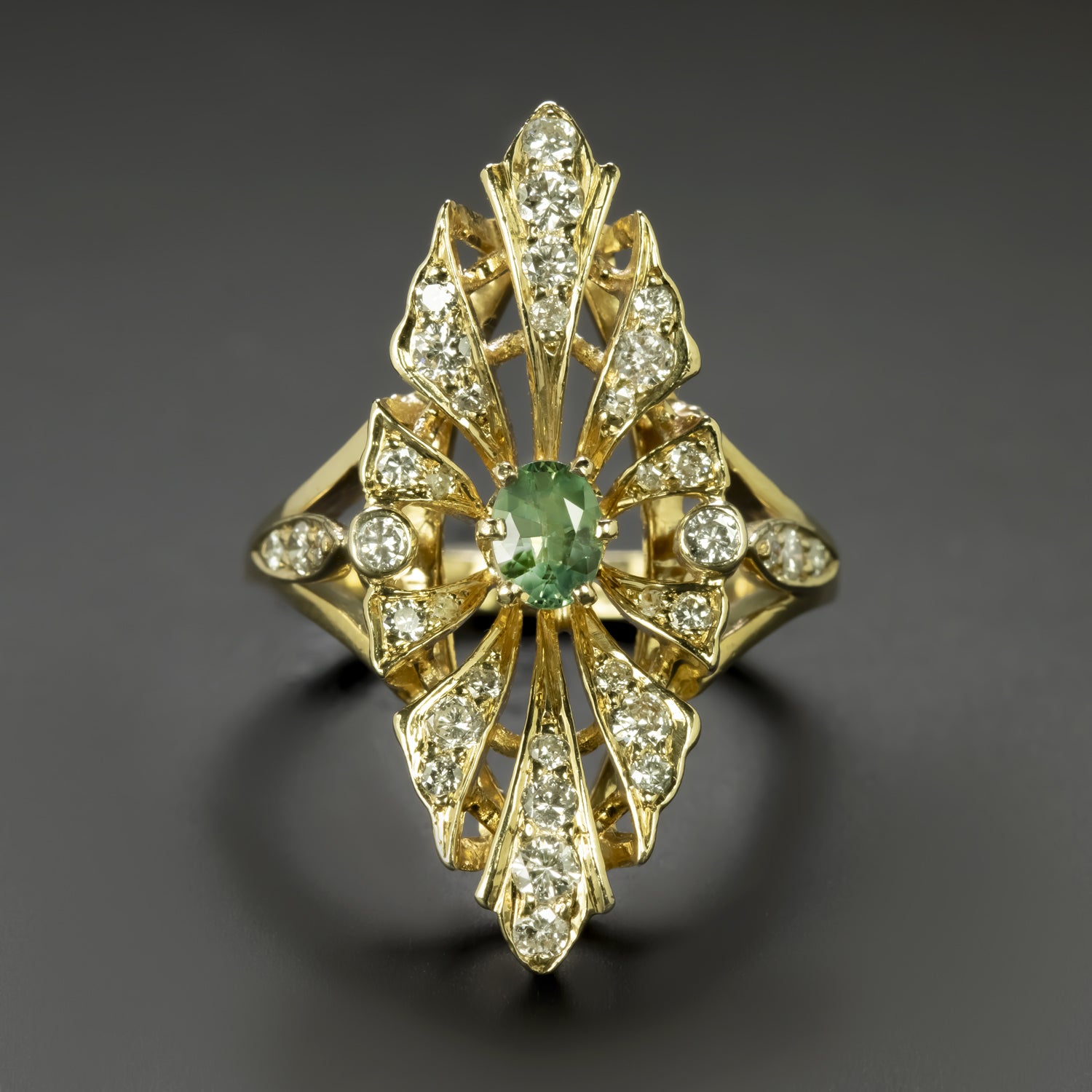 VINTAGE GREEN SAPPHIRE DIAMOND COCKTAIL RING 14k YELLOW GOLD STATEMENT ART DECO