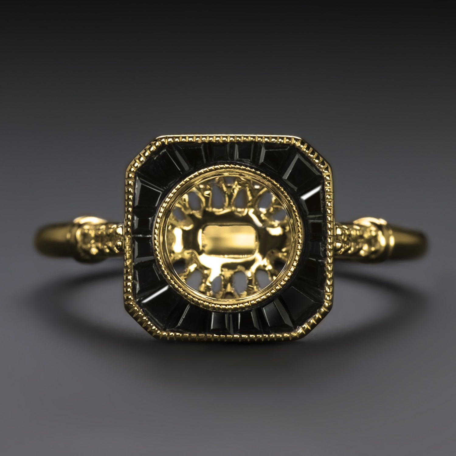 This gorgeous semi-mount is a beautifully designed modern twist on an Art Deco era target ring. The bezel setting is surrounded by an octagon shaped halo of sleek black onyx rubies!
