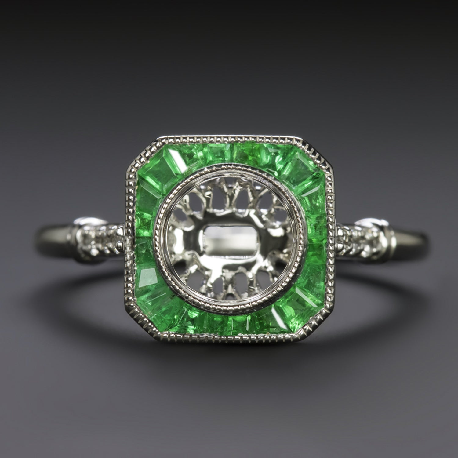 This gorgeous semi-mount is a beautifully designed modern twist on an Art Deco era target ring. The bezel setting is surrounded by an octagon shaped halo of spring green emeralds!