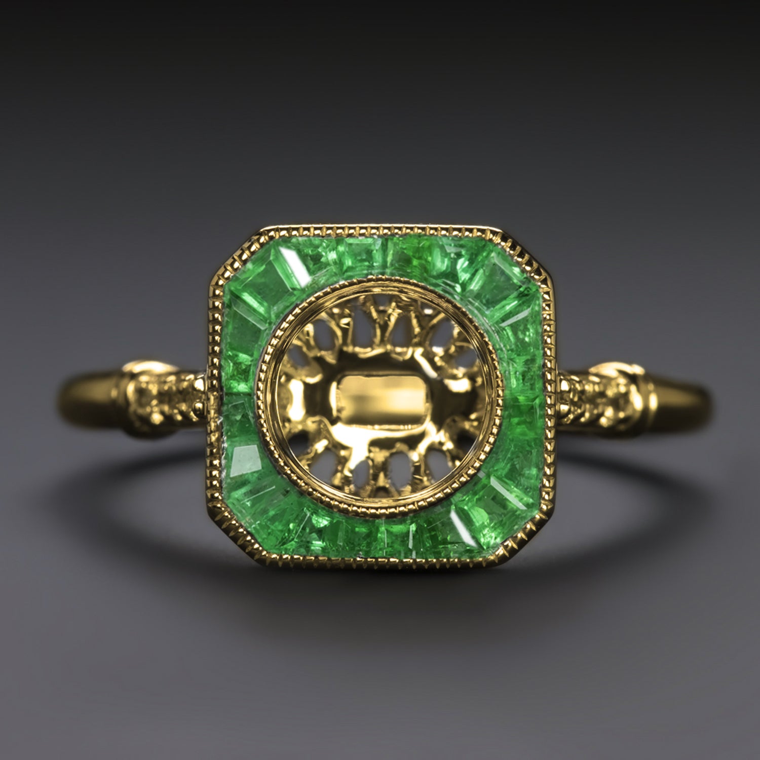 This gorgeous semi-mount is a beautifully designed modern twist on an Art Deco era target ring. The bezel setting is surrounded by an octagon shaped halo of spring green emeralds!