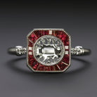This gorgeous semi-mount is a beautifully designed modern twist on an Art Deco era target ring. The bezel setting is surrounded by an octagon shaped halo of rich red rubies!
