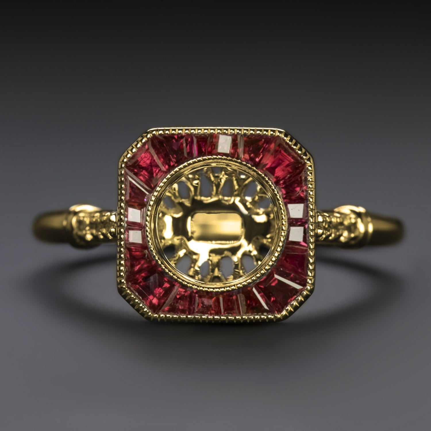 This gorgeous semi-mount is a beautifully designed modern twist on an Art Deco era target ring. The bezel setting is surrounded by an octagon shaped halo of rich red rubies!