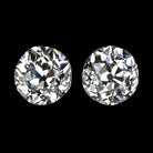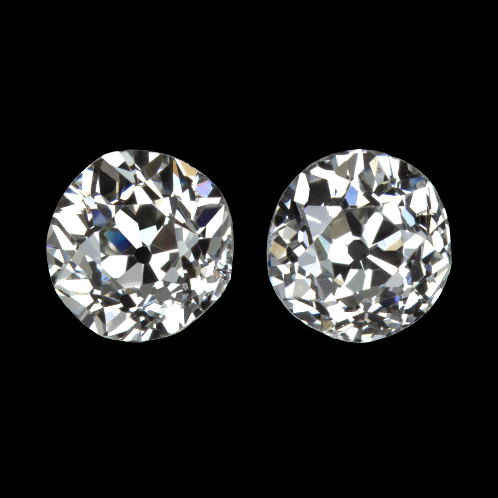 Graded G-H for color, the diamonds are bright white. They show no warmth on the face up. The diamonds are very clean, graded VS for clarity. Even under 10x magnification, it is difficult to find any inclusions. As old European cuts, the diamonds have wide, hand cut facets which return exceptional sparkle and captivating flashes of colorful fire (rainbow refractions). Overall, they have a bright, eye-catching, and lively presence!