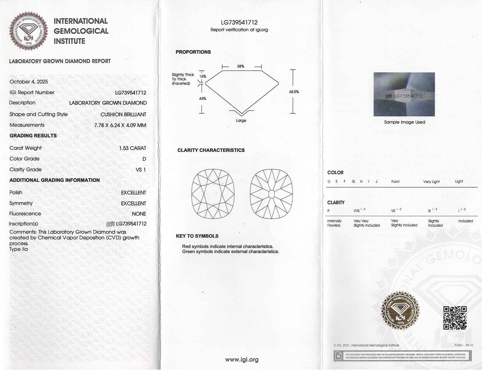 1.53ct OLD MINE CUT LAB CREATED DIAMOND CERTIFIED D VS1 CUSHION BRILLIANT 1.5ct