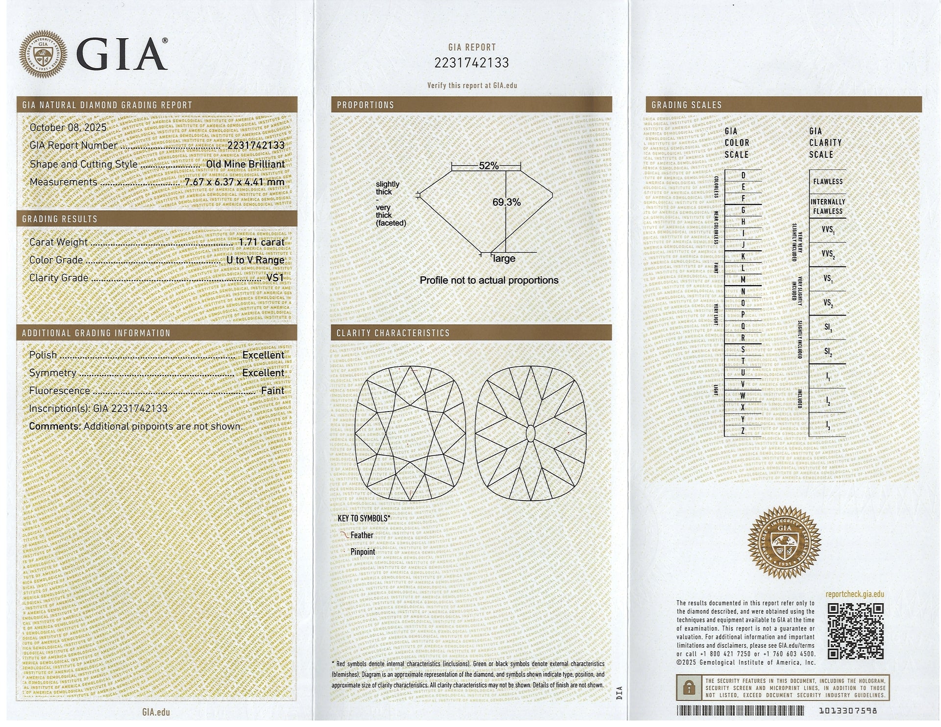 1.71ct OLD MINE CUT DIAMOND GIA CERTIFIED U-V VS1 ELONGATED CUSHION BRILLIANT