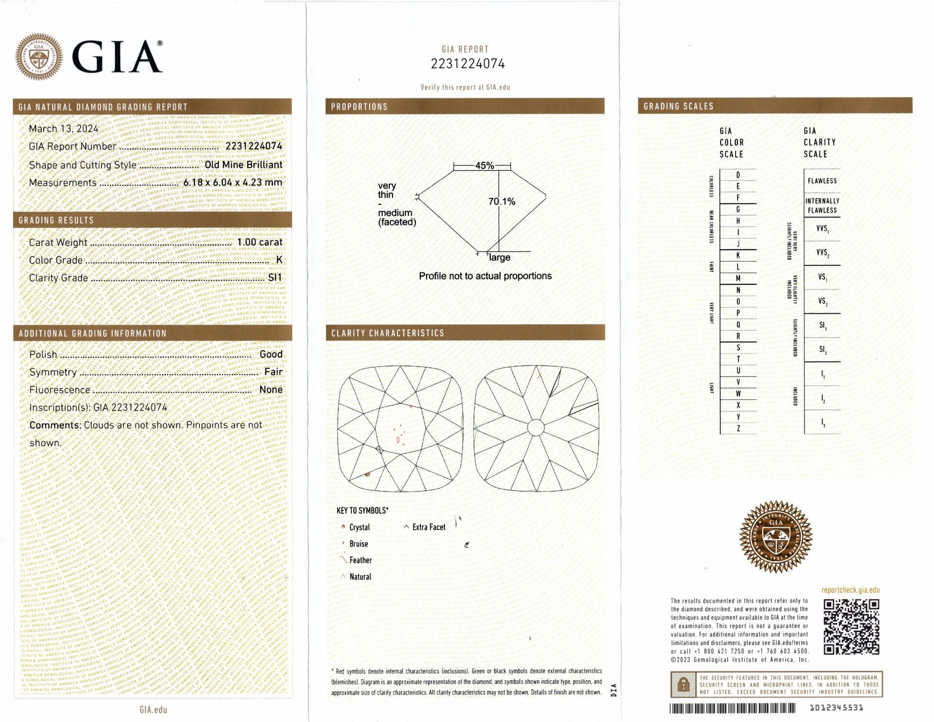 1 CARAT OLD MINE CUT DIAMOND GIA CERTIFIED K SI1 ANTIQUE LOOSE NATURAL CUSHION