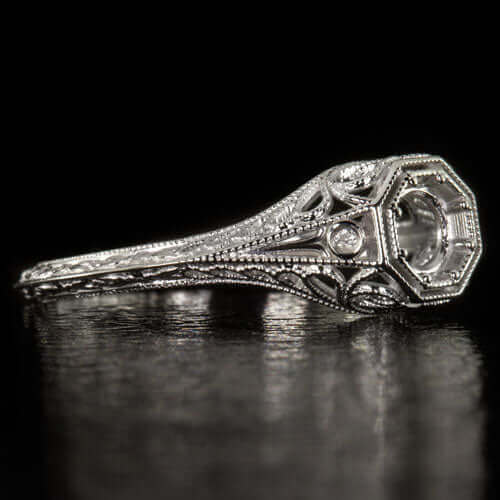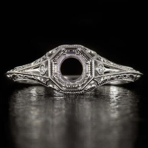 Featured here is a magnificent Art Deco inspired diamond semi-mount ring! This ring features exquisite filigree and engraved details that are sure to impress and we are confident that you will fall in love with the vintage design from the moment you first see it! Two fully faceted round cut diamonds adorn the sides of this ring, securely set next to the center mounting. The diamonds are bright white and 100% clean to the naked eye with no visible flaws or imperfections. The center mounting is ideal for a round stone and the allowable size is from 4.2mm to 4.8mm in diameter. It will look incredible with a stone from 4.4mm to 4.7mm. At the higher side of the budget, it's a little bit tight so please contact us if your local jeweler cannot set it and we can set it for you! If you do not have the perfect diamond or gemstone for this setting, please contact us for our loose stone inventory! We are sure to have something you will love that will be the perfect fit for this mounting. This ring is made from solid platinum and features absolutely stunning Art Deco inspired design. The engraving and filigree details are crisp and sharp and must be seen in person to be fully appreciated. The measurements are 7mm across (north-south) and 5.2mm from the finger to the top of the center mounting. Don't miss your chance to own this gorgeous Art Deco inspired semi-mount! This one of a kind design can only be found here! All of our items come with a 14 day return policy and an appraisal is available upon request.