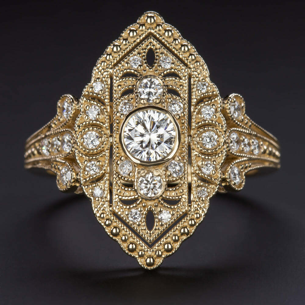 0.59ct DIAMOND NAVETTE RING VINTAGE STYLE ART DECO COCKTAIL YELLOW GOLD NATURAL