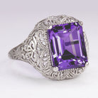 AMETHYST VINTAGE STYLE RING STERLING SILVER ART DECO EMERALD CUT FILIGREE PURPLE