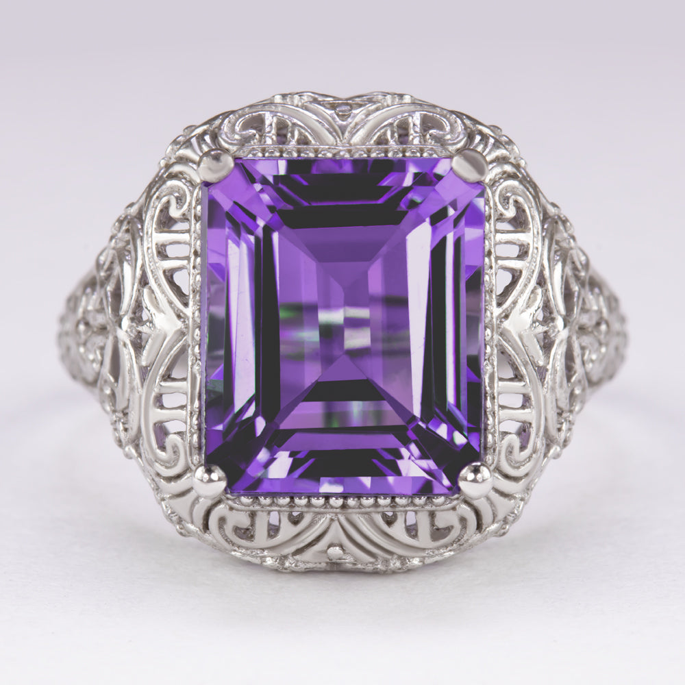This vintage style ring features a rich purple emerald cut amethyst set in a sterling silver setting. The Art Deco style setting is beautifully crafted with intricately detailed, domed filigree. The amethyst is a natural, earth mined stone. The ring measures 15.5mm across (north south) and 7mm from finger to top.