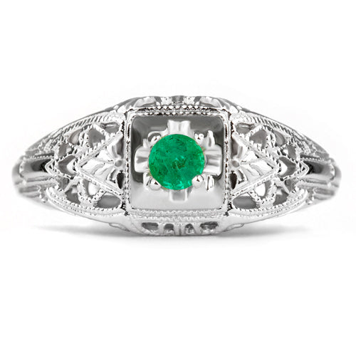 This vintage style ring features a bright green emerald set in a sterling silver setting. The setting is beautifully crafted with ethereal filigree. The emerald is a natural, earth mined stone. The ring measures 7.8mm across (north south) and 6.2mm from finger to top.