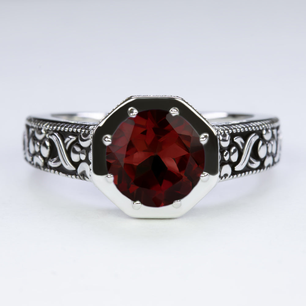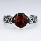 This vintage style ring features a round cut garnet set in a sterling silver setting. The substantial setting is beautifully crafted with an octagon setting and a celtic style patinaed design on the shank. The garnet is a natural, earth mined stone. The ring measures 9.9mm across (north south) and 7.5mm from finger to top.