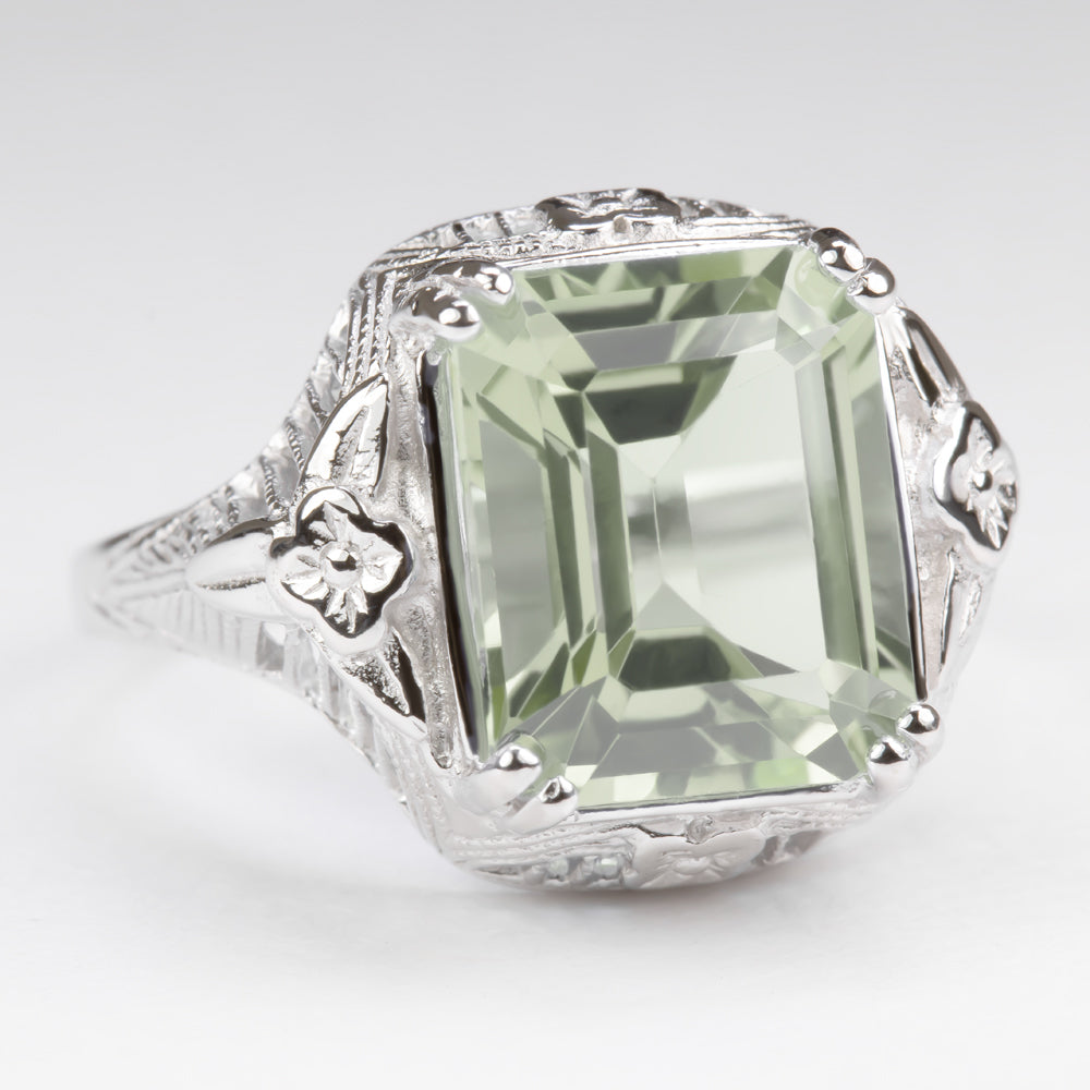 This vintage style ring features a prasiolite (green amethyst) set in a sterling silver setting. The Art Deco style setting is beautifully crafted with delicate filigree and floral accents. The amethyst is a natural, earth mined stone. The ring measures 14mm across (north south) and 7mm from finger to top.
