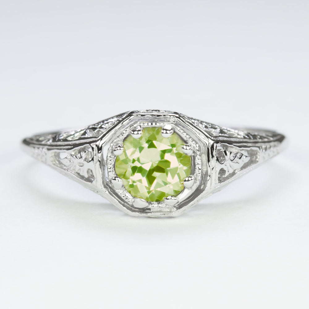 This vintage style ring features a bright green round cut peridot set in a sterling silver setting. The Art Deco style setting is beautifully crafted with an octagon setting and curling filigree. The peridot is a natural, earth mined stone. The ring measures 7mm across (north south) and 6mm from finger to top.